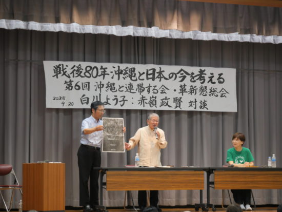高知県革新懇は20日、高知市で「第6回沖縄と連帯する会~戦後80年沖縄と日本の今を考える」を開き、会場いっぱいの約130人が参加しました。日本共産党の赤嶺政賢衆院議員と白川容子参院議員が対談し、「今やるべきは戦争の準備でなく、平和外交だ。沖縄と本土が連帯してたたかいを広げていこう」と呼びかけました。