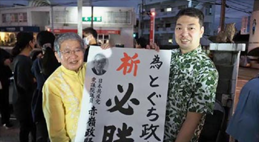 とぐち氏は、町面積の53%が米軍基地に奪われている土地を返還させ、町の財政力を高めていくと強調。「北谷町がめざすのは、国の交付税のいらない自立した経済、自治体であり、そのためにも基地を確実に減らしていくということがとても重要。みなさんの支えで公約を一つひとつ実現し、未来の子どもたちに発展をつないでいきたい」と決意表明しました。