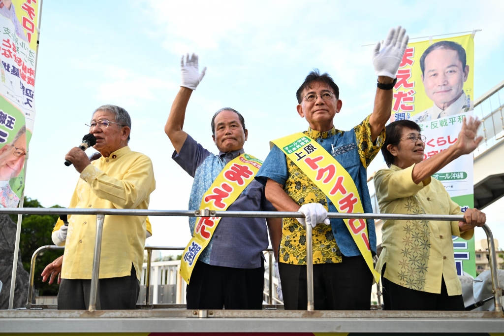 11月16日投票の沖縄県糸満市議選(定数21)が告示された9日、日本共産党の赤嶺政賢衆院議員は、まえだ潤=現=、上原トクイチロー=新=両候補の応援に入り、「市民生活応援の政治を掲げる共産党の2人を何としても勝ち抜かせてほしい」と力を込めました。