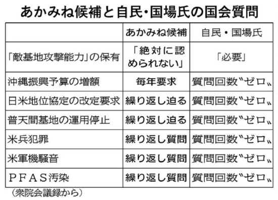沖縄振興予算の確保について一度も質問で取り上げていません。日米地位協定も、改定に意欲を示した石破茂首相(当時)に「取り組んでいただきたい」と述べただけ。正面から改定を迫ったことはありません。米兵犯罪や米軍機の騒音、有機フッ素化合物PFASを国会質問で取り上げたことがないのは、沖縄選挙区に立候補した自民前職4氏で国場氏だけです。(しんぶん赤旗 2026年2月4日)